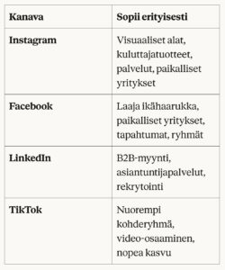 Tässä on yleisin virhe: yrittäjä avaa tilit kaikkiin mahdollisiin kanaviin ja väsyy muutamassa viikossa. Aloita 1–2 kanavalla ja tee ne kunnolla.